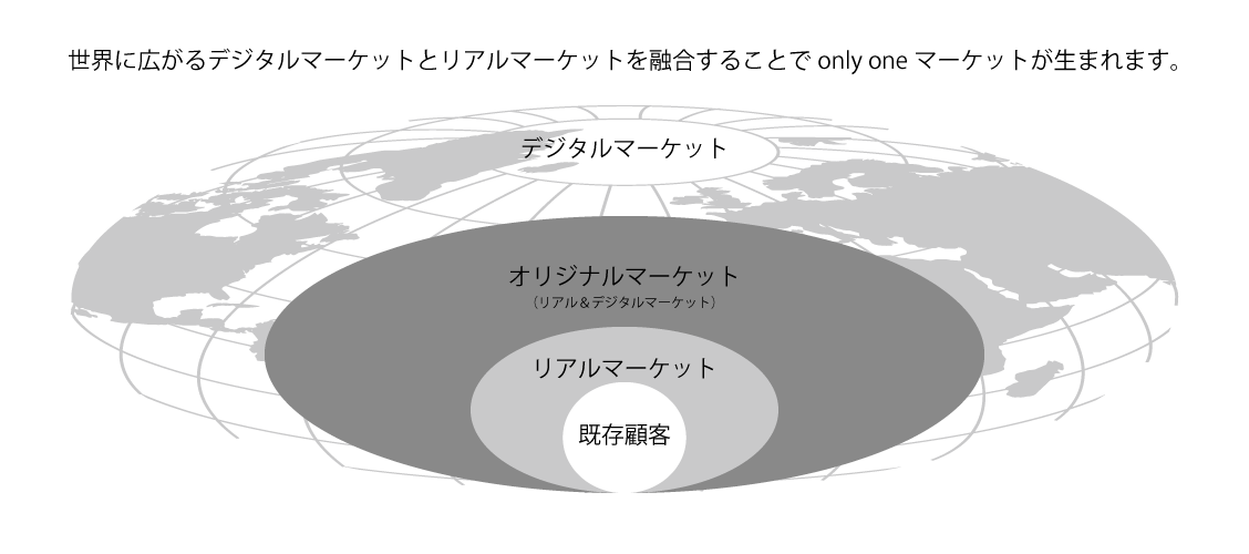 smartphoneなどの通信機器の普及によりSNSなどデジタルマーケットの存在が大きくなってきました。その反面、情報過多によって消費者の選択肢が多種多様化し企業の目指すマーケットがわかりにくくなってきているのも事実です。この時代デジタルマーケットの活用を上手く活かしていかないと社会に望まれる企業となるのは難しいといえます。しかし複雑で進歩の早いデジタルマーケットも基本は人と人の関係性です。デジタルマーケットとリアルマーケットを融合し、独自のマーケットを構築することで求められる「only one」な仕組み(戦略)を作りが可能になってくるのです。