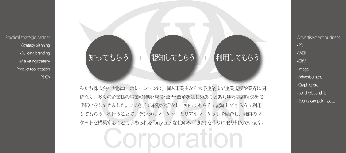 「会社の特徴を活かした事業を広めたい」「新規のお客様を開拓したい」「目標の売り上げを達成したい」「もっと地域密着する会社にしたい」など様々な目標はあると思います。またマーケティングをはじめとした多くの書籍やWebサイトも公開され、セミナー、経営コンサルタントなども開催されています。しかし具体的にどのように取り組んでいくかはあまり良く知られていません。もちろんやり方も企業の数だけ異なります。私たちは、企業規模、業種業界など多種多彩な企業のデジタルマーケティングとリアルマーケティングの融合し、「only one」のマーケットを構築し目標達成をしてきました。この経験を活かし求められる企業の仕組み作りと共に「only one」のマーケットを確立します。